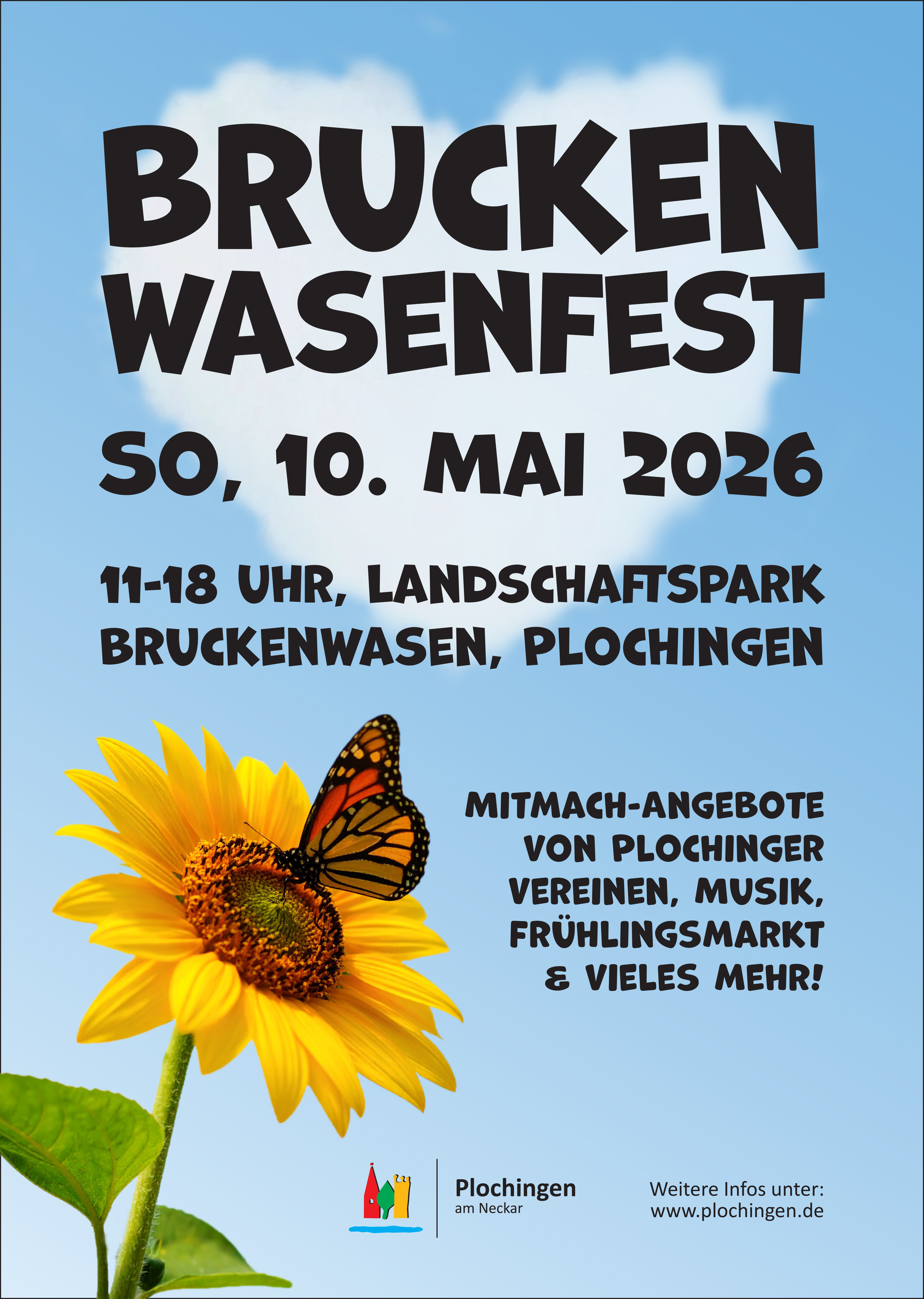 Am Sonntag, 10. Mai 2026, verwandelt sich der Landschaftspark Bruckenwasen von 11 bis 18 Uhr wieder in ein buntes Festgelände. Zahlreiche Plochinger Vereine, Einrichtungen und Gastronomen laden zu einem mitreißenden Tag voller Unterhaltung, Kreativität und Musik für Jung und Alt ein. Im ganzen Park gibt es viel zu entdecken: Kinder können sich unter anderem auf Bastel- und Spielangebote, Bogenschießen, Bärenhospital, Hüpfburg und Dampfbahnfahrten freuen, während Besucher aller Altersgruppen Vorführungen und ein abwechslungsreiches Musikprogramm genießen. Abgerundet wird das Fest durch einen Frühlingsmarkt mit einzigartigem Kunsthandwerk und blühenden Inspirationen. Für das leibliche Wohl sorgen die Plochinger Vereine und ortsansässigen Gastronomen. Das Bruckenwasenfest verbindet Natur, Gemeinschaft und das lebendige Vereinsleben in fröhlicher Atmosphäre – ein Fest für alle Generationen.