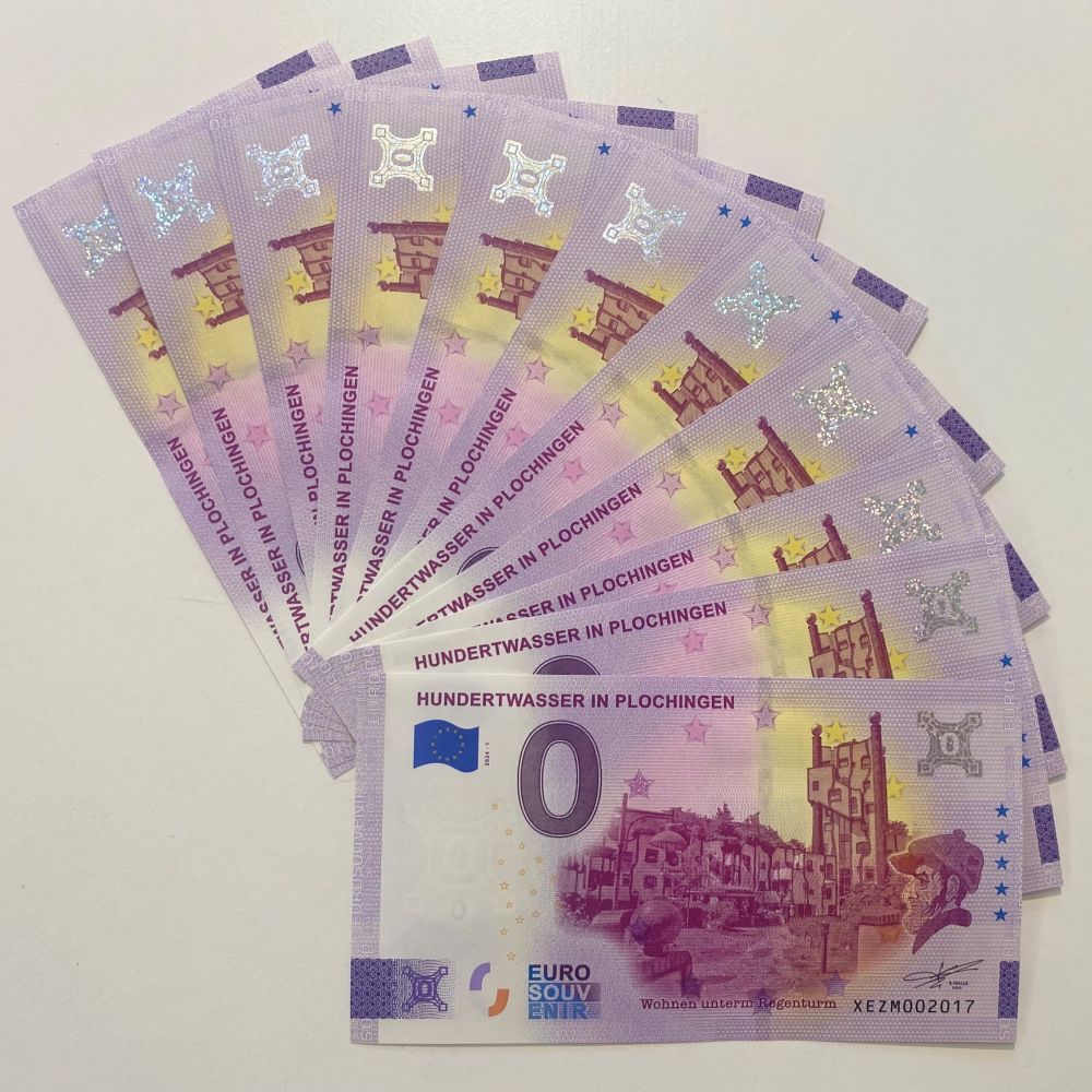 Heute sind Souvenir-Scheine an zahlreichen touristischen Attraktionen in ganz Europa nicht mehr weg zu denken. Nun kann ab sofort auch in der PlochingenInfo für 3 € der erste Plochinger 0-Euro Schein erworben werden. Zum Thema dieses Souvenir-Scheins wurde die von Friedensreich Hundertwasser gestaltete Anlage „Wohnen unterm Regenturm“ gemacht. Seit vielen Jahrzehnten ist das Wahrzeichen der Stadt Plochingen zu einem Anziehungspunkt für kleine und große BesucherInnen aus der Region, Deutschland und vielen anderen Ländern geworden.