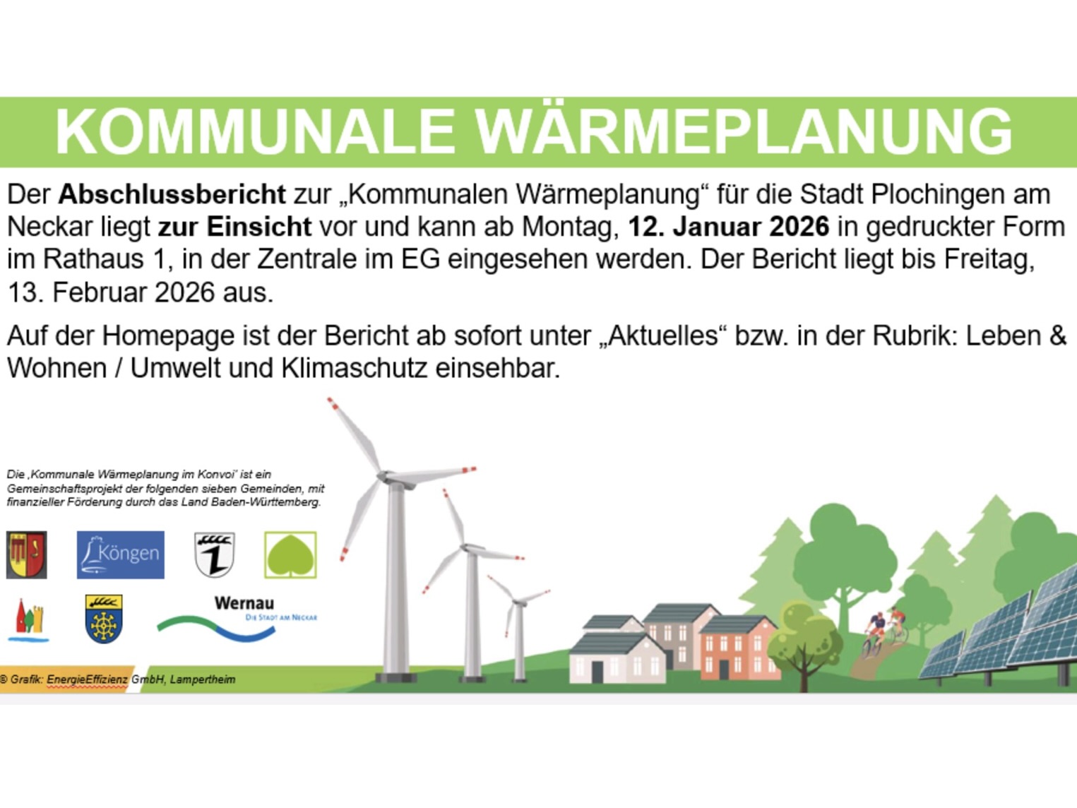 Hier finden Sie den Abschlussbericht zur kommunalen Wäremplanung (PDF / 18,927 MiB) in Plochingen. Diesen können Sie im Rathaus I, Schulstraße 7, EG/Zentrale vom 12.01.26 bis 13.02.26 einsehen.