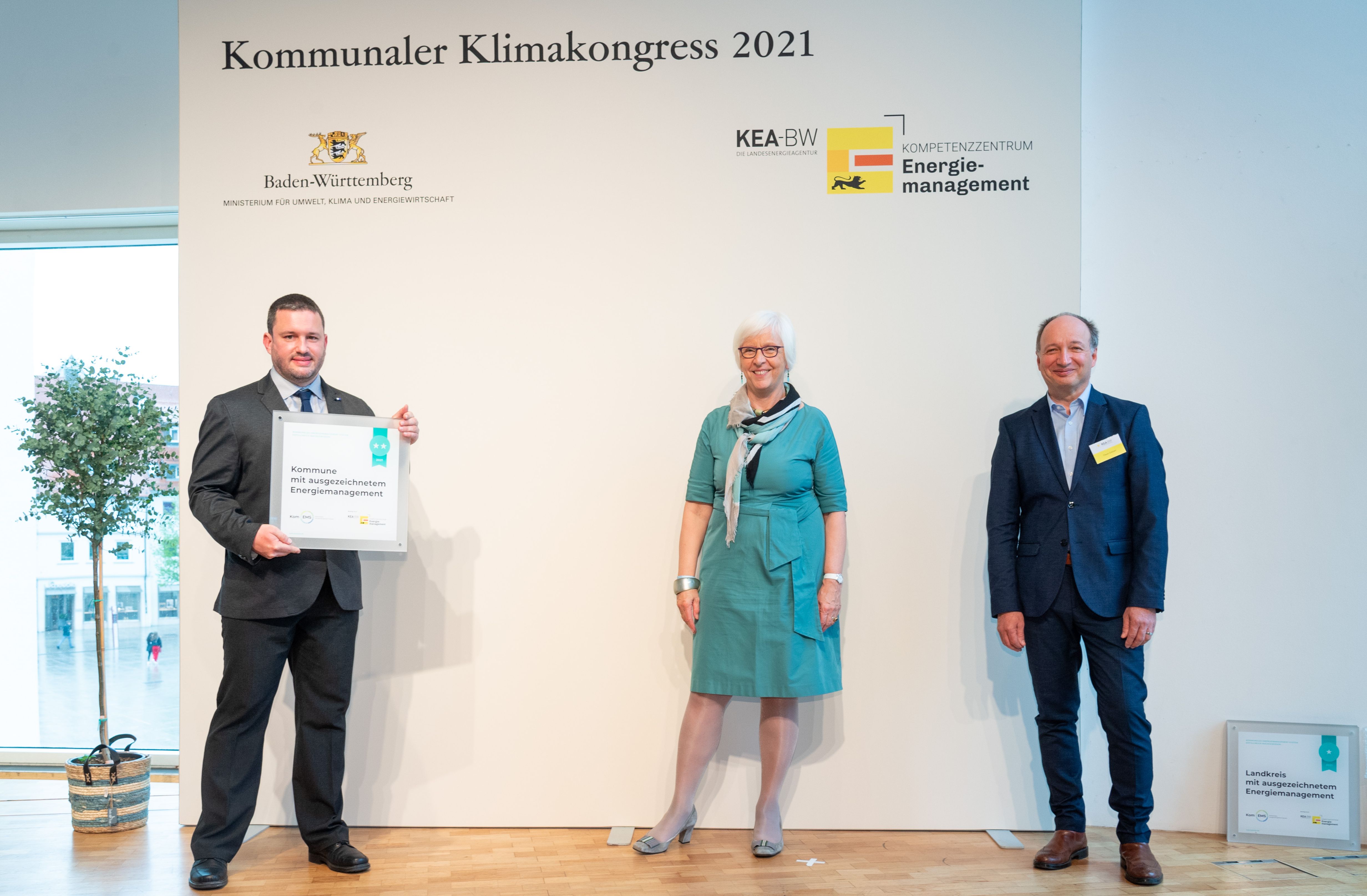 Thomas Silberhorn (links), Energiemanager der Stadt Plochingen, nimmt die Kom.EMS-Auszeichnung durch Gudrun Heute-Bluhm, Geschäftsführendes Vorstandsmitglied des Städtetags Baden-Württemberg und Claus Greiser, Leiter des kommunalen Energiemanagements der KEA-BW, entgegen.