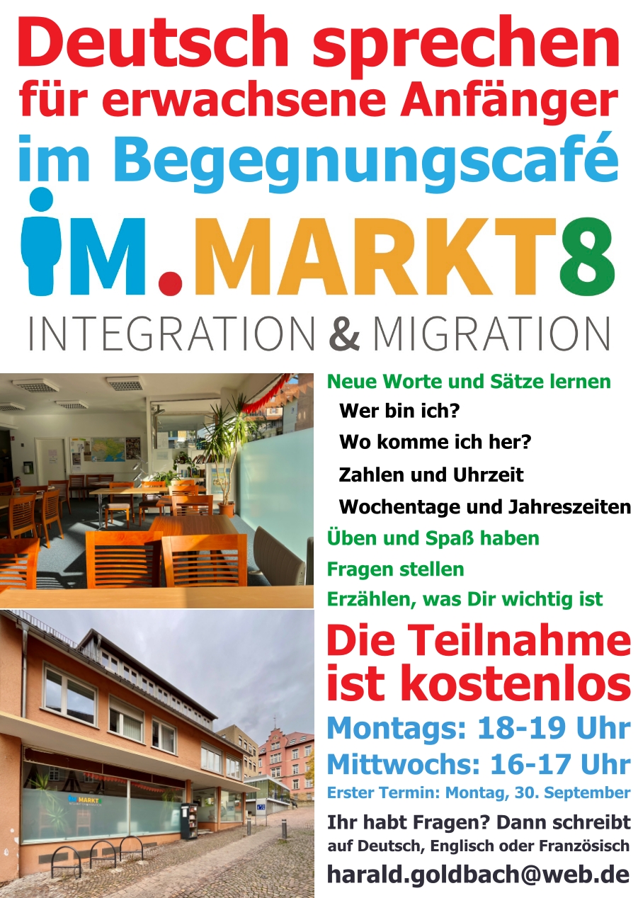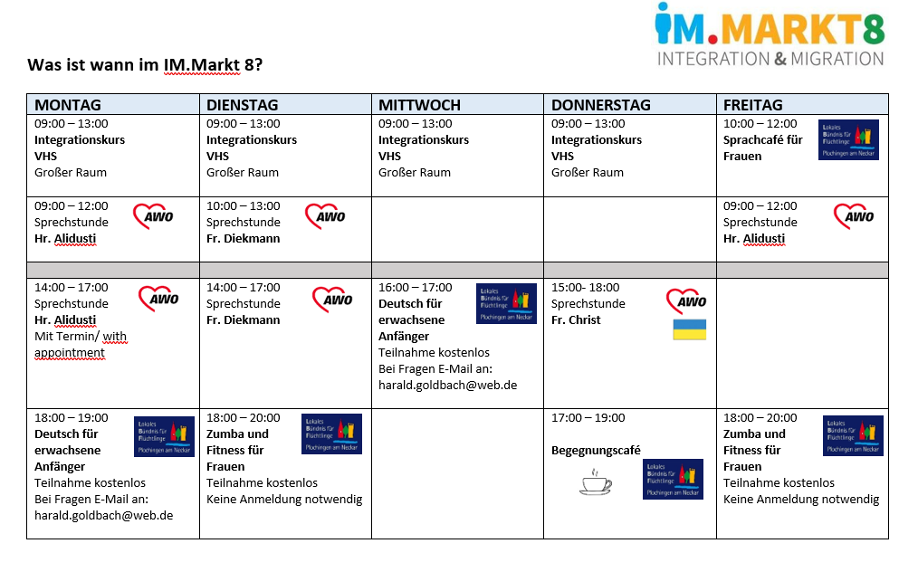 Jeden Donnerstag von 17 bis 19 Uhr lädt das Lokale Bündnis für Flüchtlinge zum Begegnungscafé im.Markt8 ein. Ein Treffen für Plochinger Bürgerinnen und Bürger und Geflüchtete. Darüber hinaus bietet das Lokale Bündnis für Flüchtlinge niedrigschwellige Möglichkeiten Deutsch zu sprechen ohne Prüfungsdruck an.