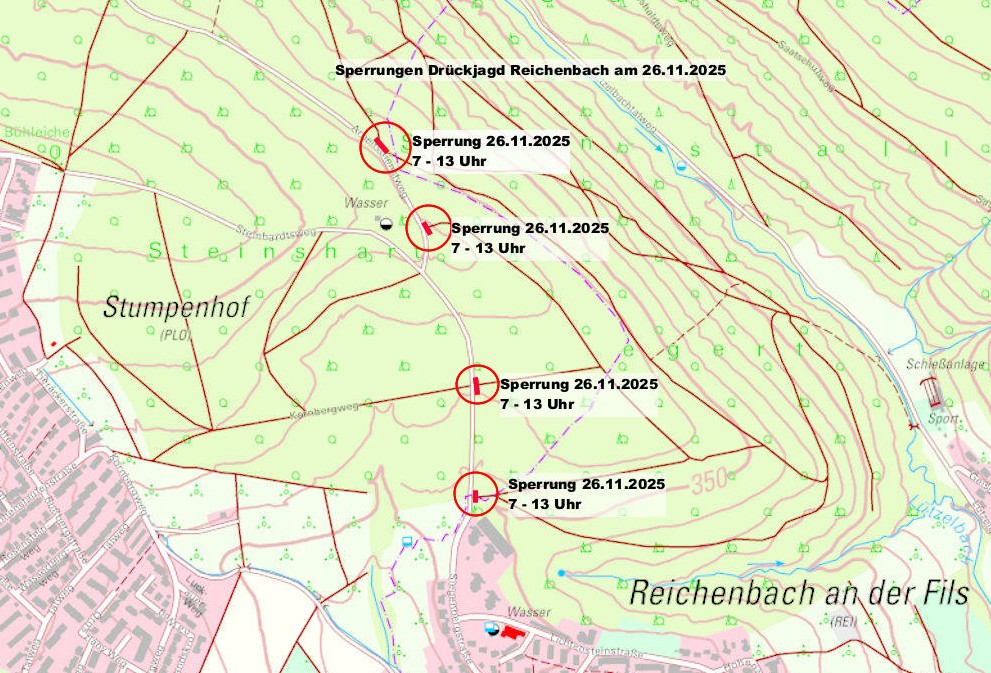 Da der Stadtwald Plochingen und der Gemeindewald Reichenbach im Bereich „Siegenberg“ aneinander angrenzen, werden die Zuwegungen von Plochinger Seite in den Reichenbacher Wald zur Jagd gesperrt. Die Sperrungen dauern von 7 Uhr bis 13 Uhr und werden durch den Reichenbacher Jagdpächter Thomas Scheer durchgeführt. Durch die Sperrungen wird eine Gefahr für Waldbesucher verhindert.