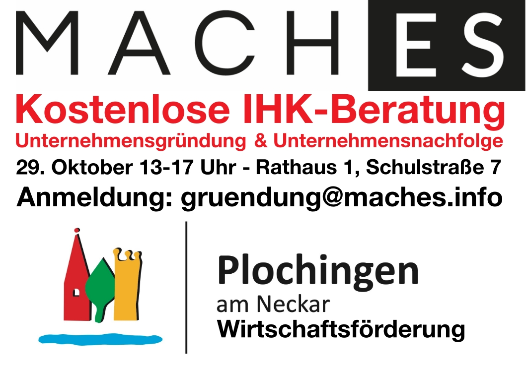 Sie planen eine Unternehmensgründung, eine Selbstständigkeit oder Ihr Unternehmen an die nächste Generation zu übergeben? Dann lassen Sie sich kostenlos beim Sprechtag in Plochingen von Experten der IHK beraten. Wann? 29.10.2025, 13-17 Uhr. Wo: Rathaus I, Schlustraße 7 in Plochingen. Anmeldung unter: gruendung@maches.info
