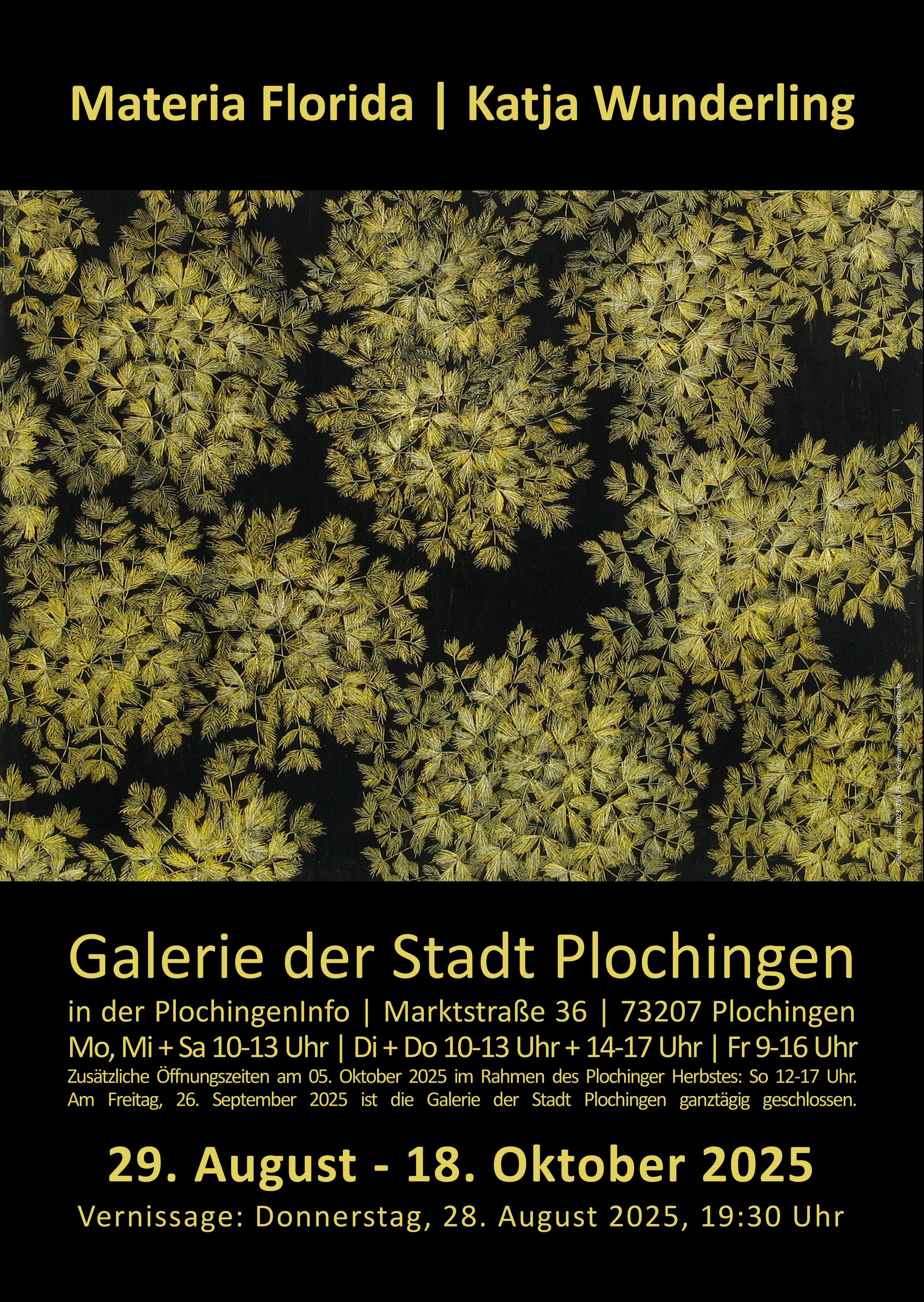 Öffnungszeiten der Ausstellung: Mo, Mi, Sa 10-13 Uhr | Di, Do 10-13 Uhr + 14-17 Uhr | Fr 09-16 Uhr | zusätzliche Öffnungszeiten am 05. Oktober 2025 im Rahmen des Plochinger Herbstes von 12-17 Uhr | am Freitag, 26. September 2025 ist die Galerie der Stadt Plochingen ganztägig geschlossen