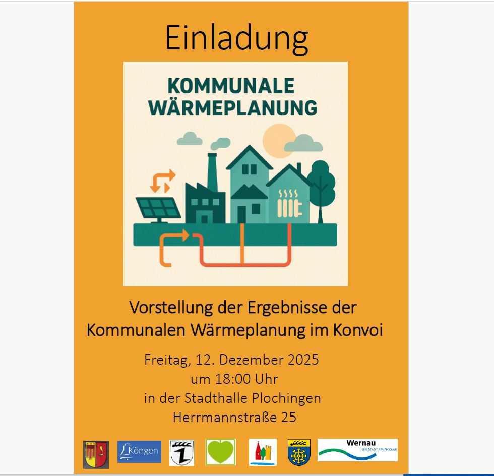 Derzeit wird für Plochingen im Konvoi mit sechs Nachbarkommunen die Kommunale Wärmeplanung erstellt. Die öffentliche Abschlussveranstaltung, in der Zielszenarien und Umsetzungsstrategien vorgestellt werden, findet am Freitag, den 12. Dezember um 18 Uhr in der Stadthalle Plochingen statt. Bürgerinnen und Bürger haben die Gelegenheit, sich umfassend zu informieren und sich mit ihren Fragen und Ideen einzubringen.